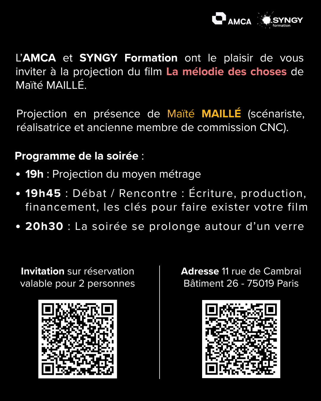 Projection dans la nouvelle école de cinéma AMCA d'un moyen métrage qui a eu le CNC Arte et la région.
