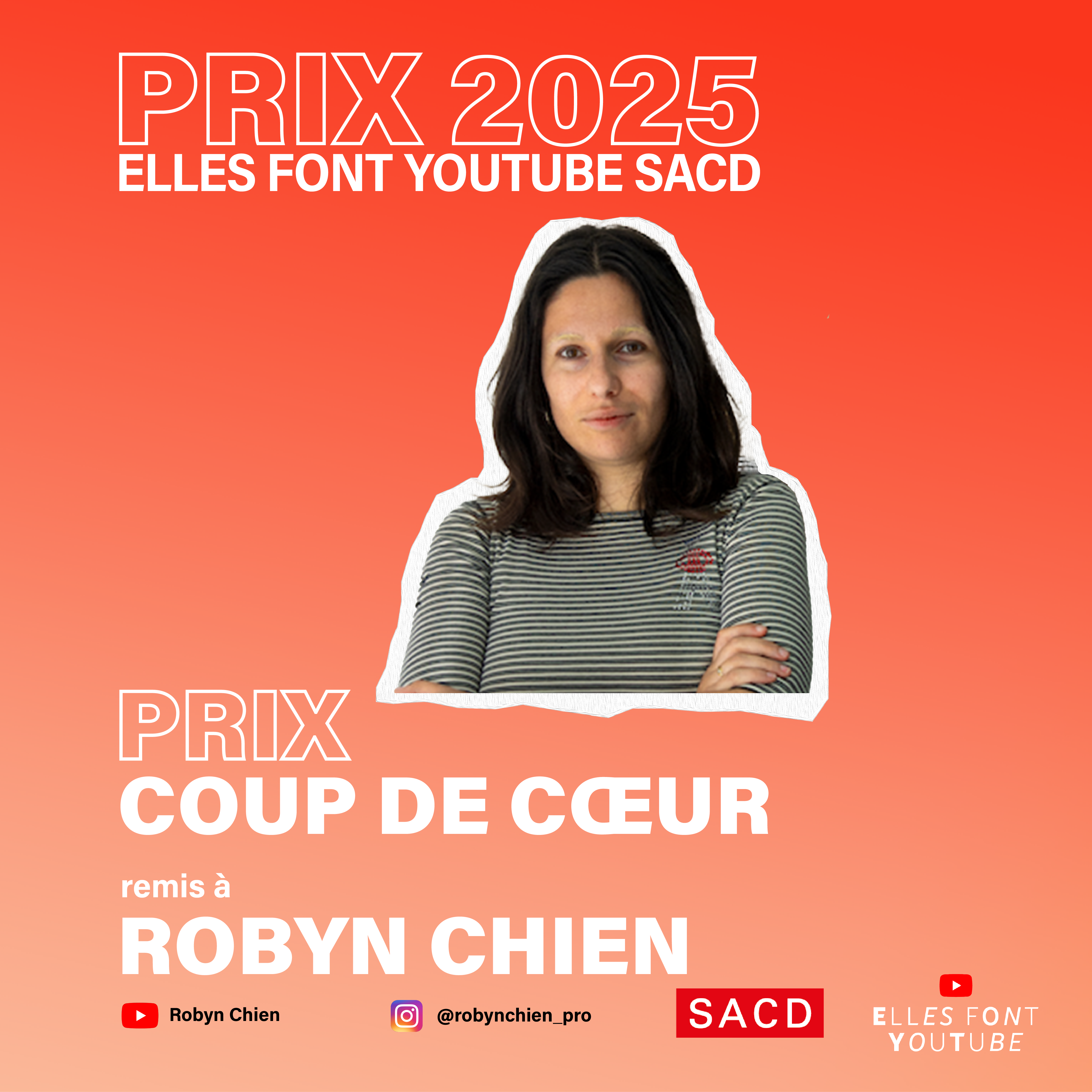 « À travers les prix Elles font YouTube – SACD, nous célébrons le talent, la créativité et l’engagement des femmes qui façonnent le paysage numérique avec audace et originalité. Ces créatrices réinventent les codes, racontent le monde autrement et ouvrent la voie à une expression plus libre, plus diverse et plus inclusive. La SACD est fière de les soutenir et de contribuer à leur reconnaissance. »