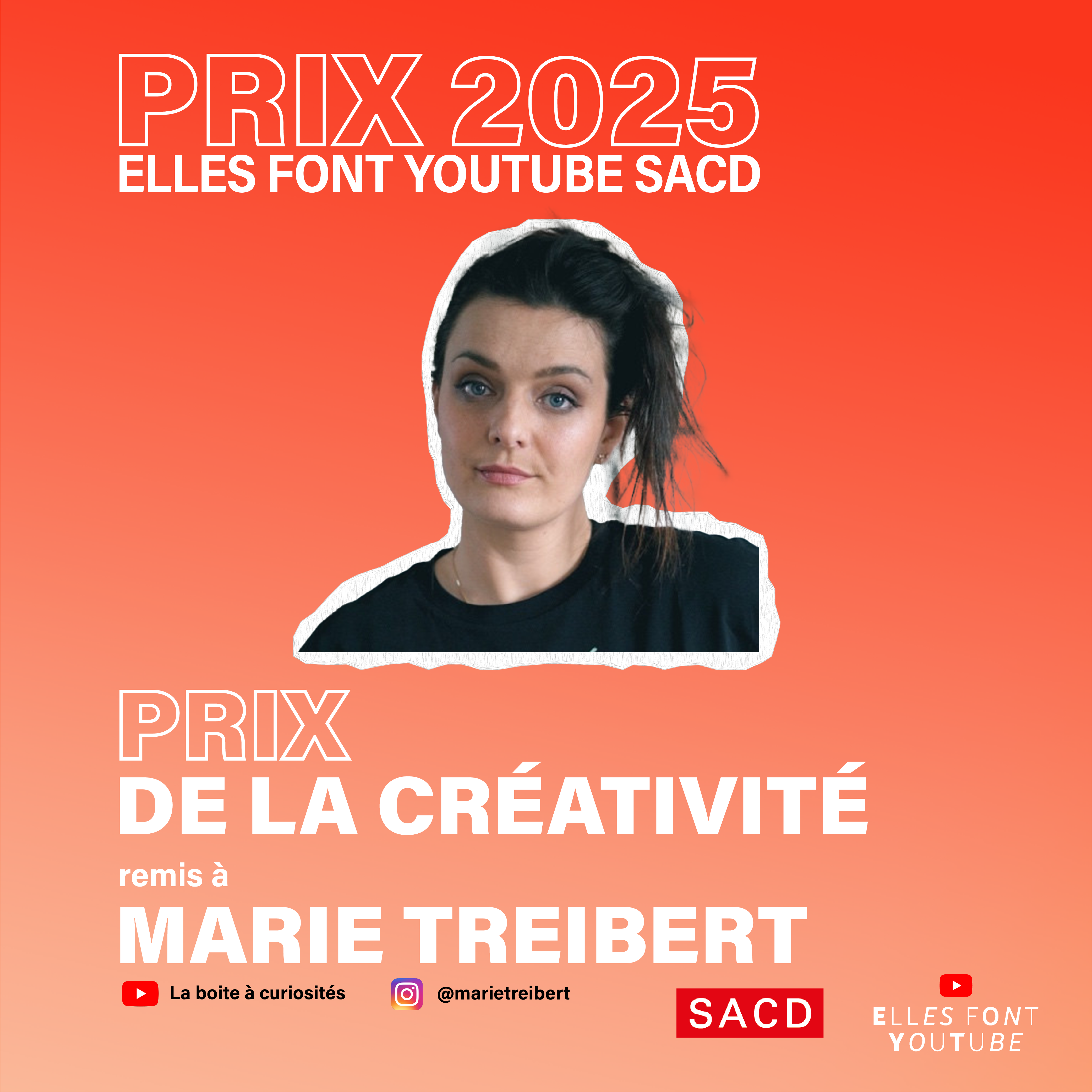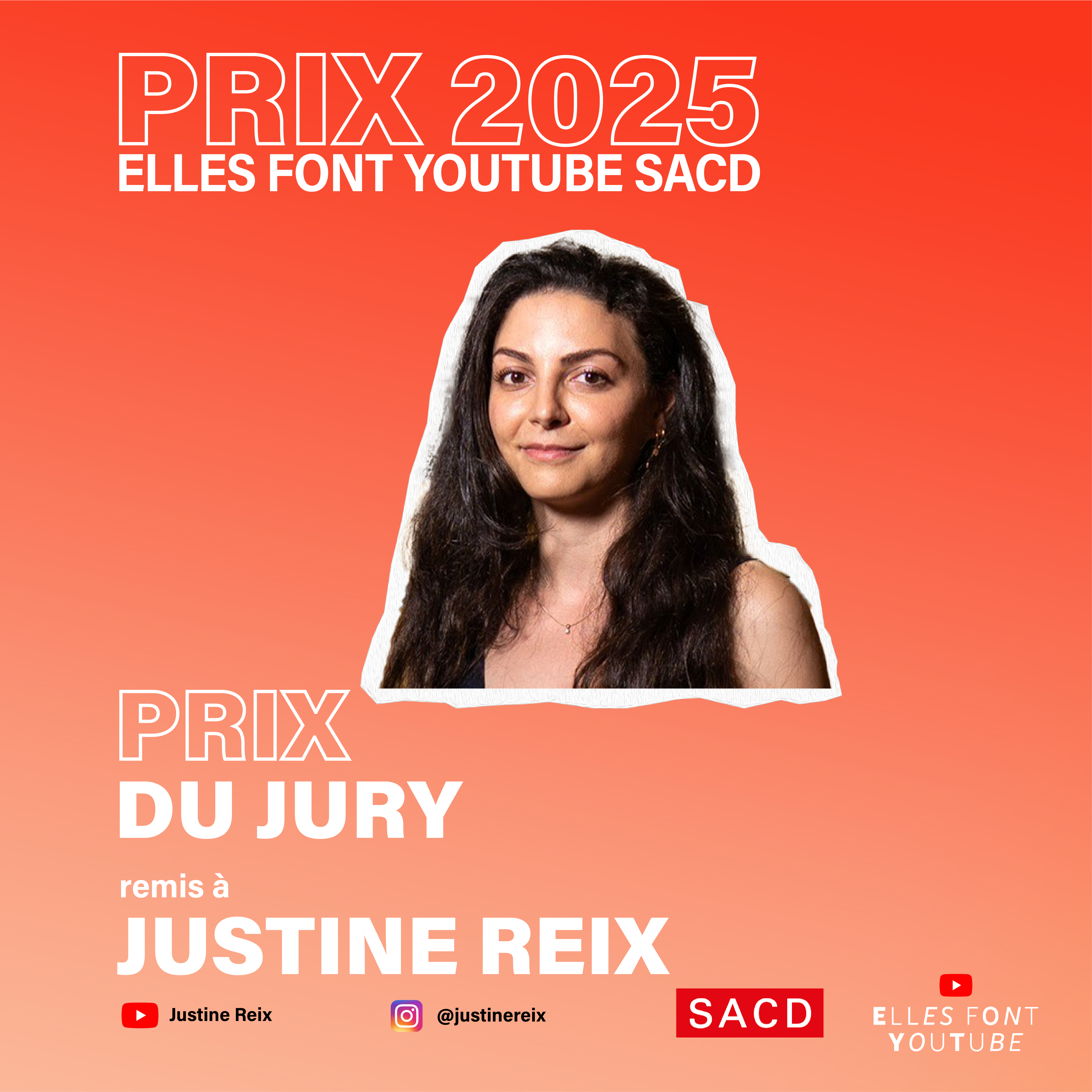 « À travers les prix Elles font YouTube – SACD, nous célébrons le talent, la créativité et l’engagement des femmes qui façonnent le paysage numérique avec audace et originalité. Ces créatrices réinventent les codes, racontent le monde autrement et ouvrent la voie à une expression plus libre, plus diverse et plus inclusive. La SACD est fière de les soutenir et de contribuer à leur reconnaissance. »